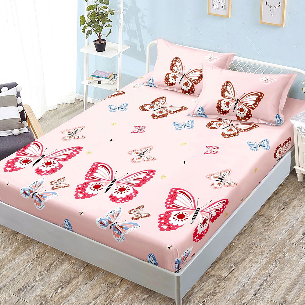 Cearceaf din Bumbac Satinat cu Elastic - 160x200 + 2 Fete Perna - Roz cu Fluturi - CEFN_K012C