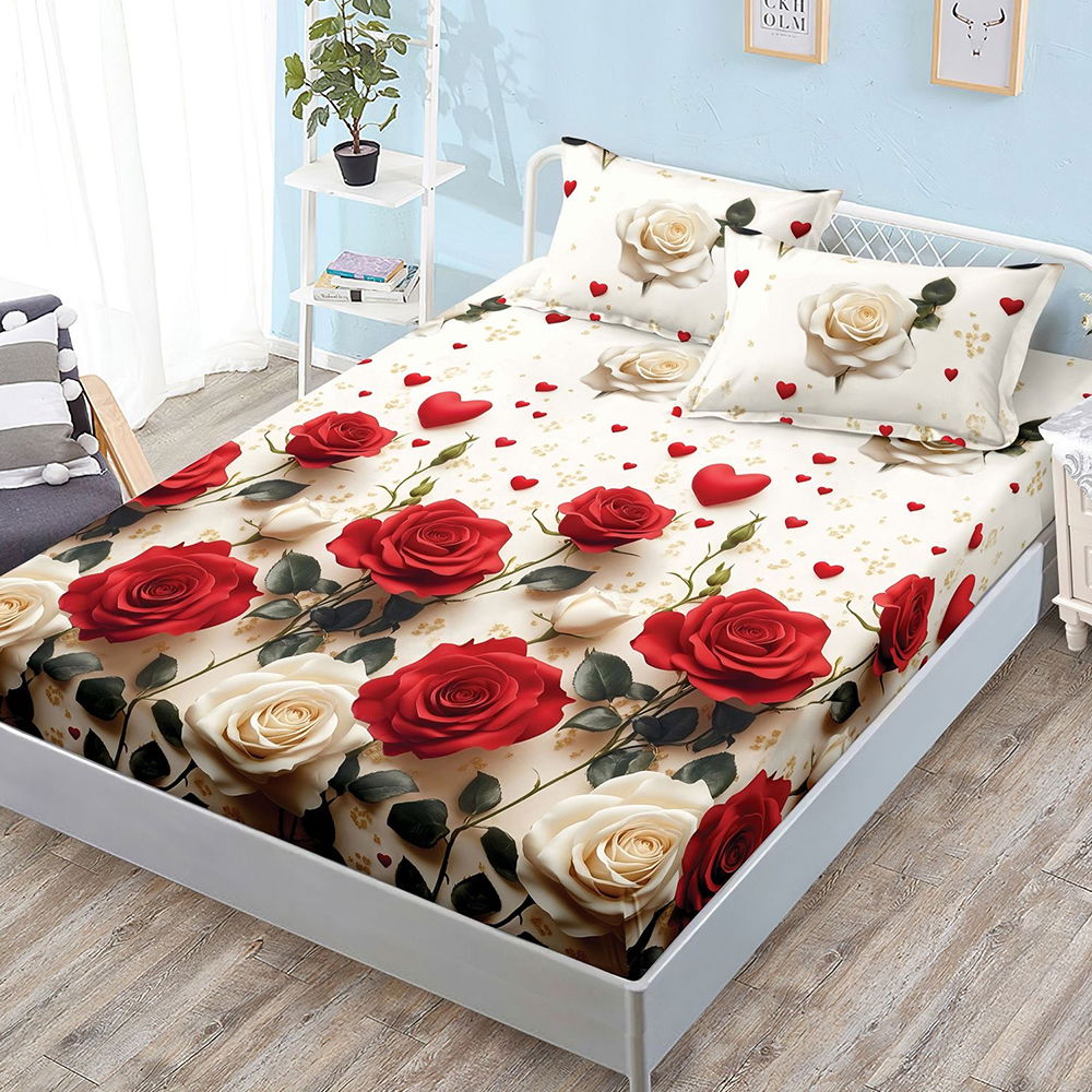 Cearceaf din Bumbac Satinat cu Elastic - 160x200 + 2 Fete Perna - Trandafiri Rosii si Crem - CEFN_L108C