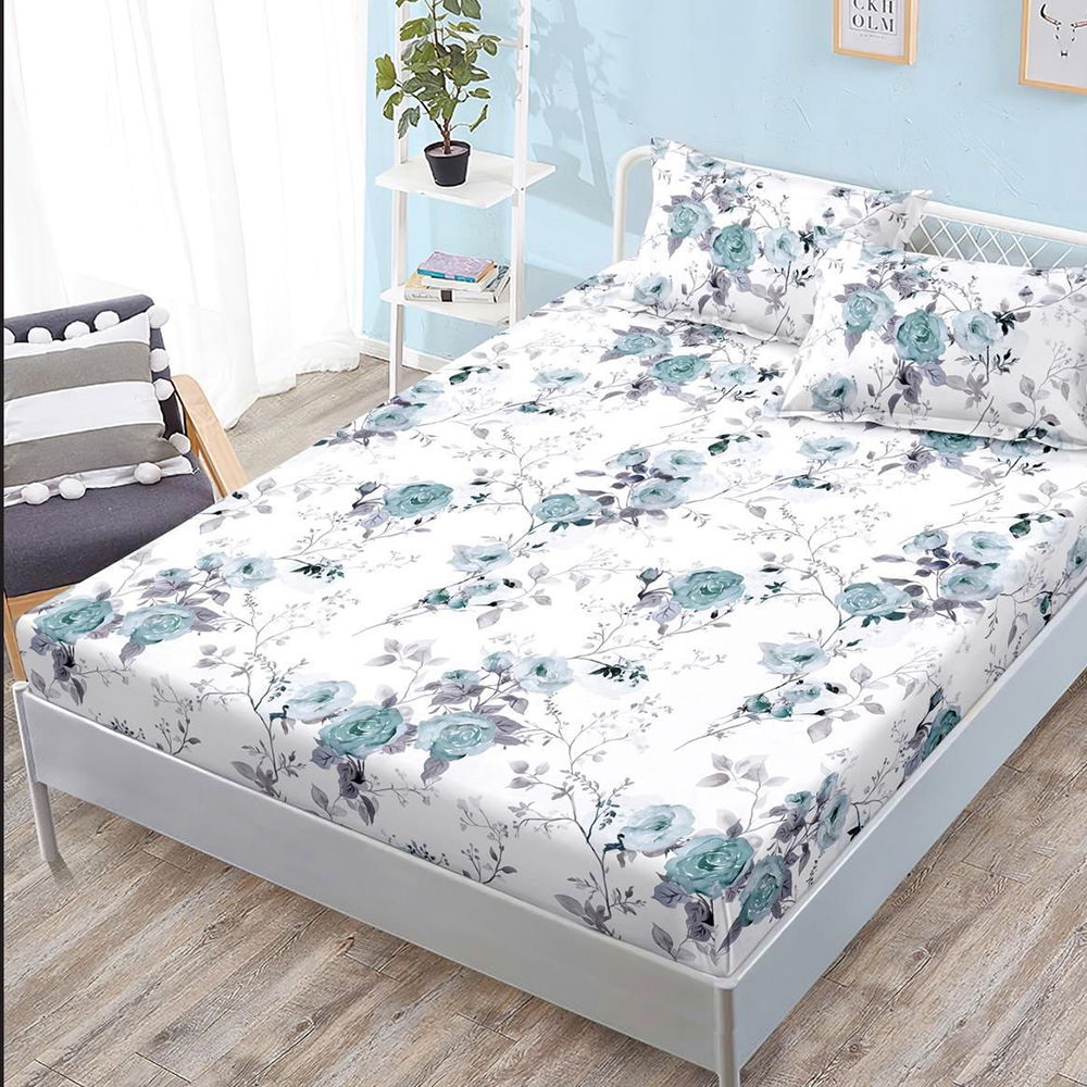 Cearceaf din Bumbac Satinat cu Elastic - 180x200 + 2 Fete Perna - Trandafiri Degrade Turcoaz - CEFN_K003B