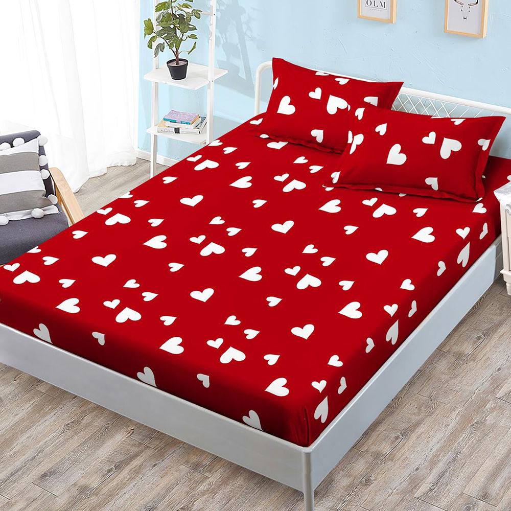 Cearceaf din Finet cu Elastic - 160/180x200 + 2 Fete Perna - Rosu cu Inimioare Albe - CEFN_K028C