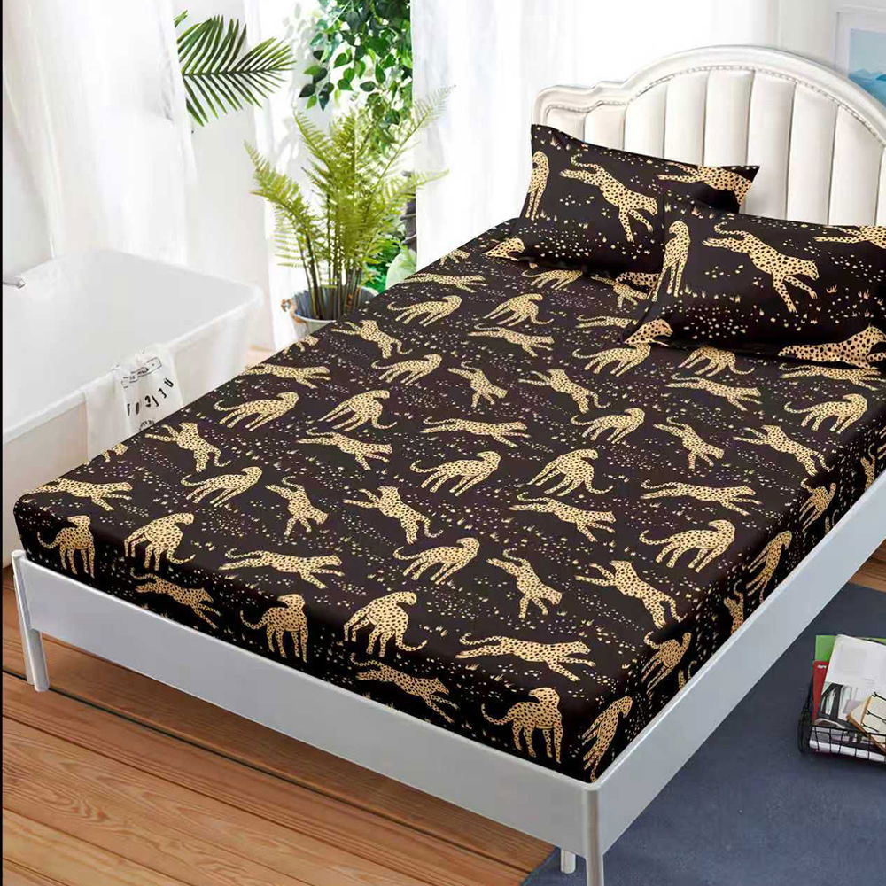Cearceaf din Bumbac Satinat cu Elastic - 180x200 + 2 Fete Perna - Maro cu Pantere - CEFN_K016B