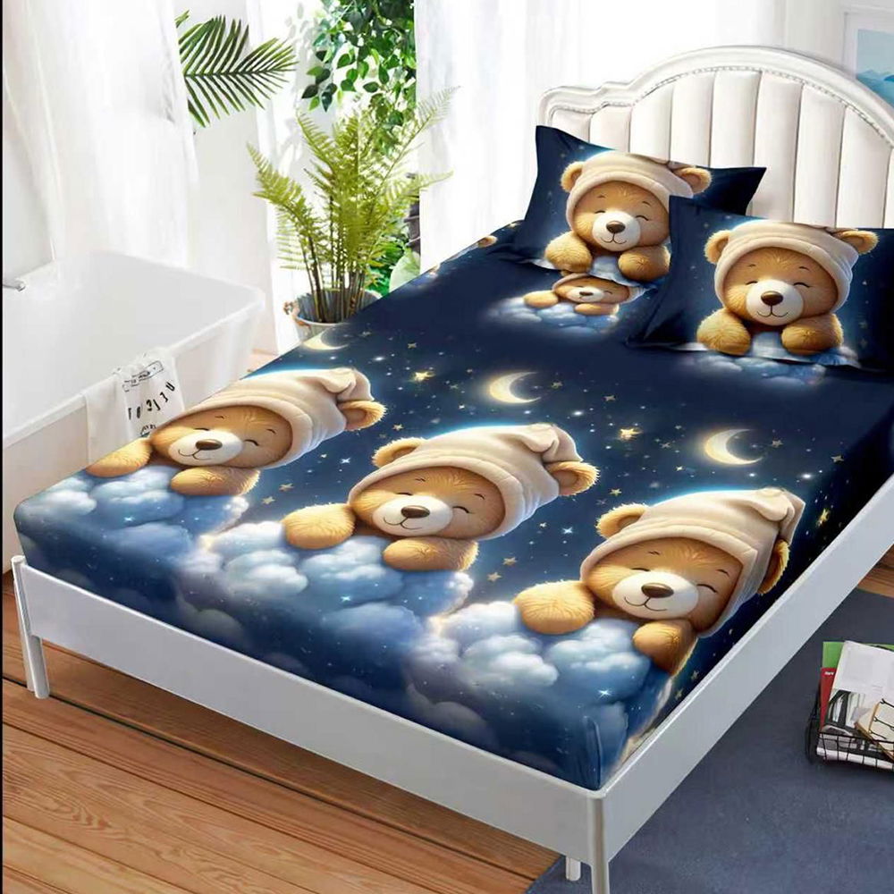 Cearceaf din Bumbac Satinat cu Elastic - 180x200 + 2 Fete Perna - Noapte Buna Ursuleti! - CEFN_K001
