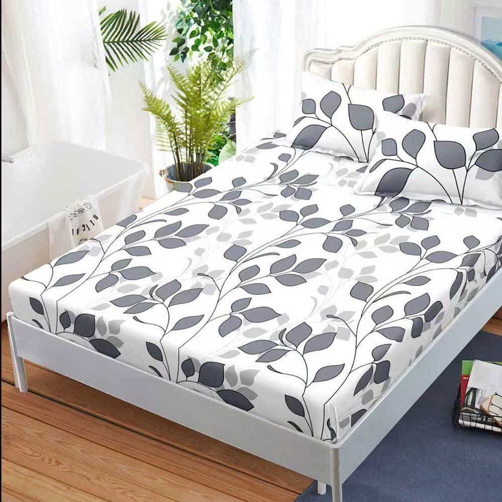 Cearceaf din Bumbac Satinat cu Elastic - 180x200 + 2 Fete Perna - Frunze Gri - CEFN_K022B