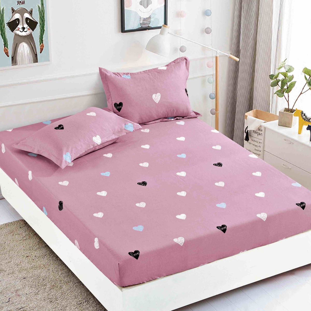 Cearceaf din Bumbac Satinat cu Elastic - 180x200 + 2 Fete Perna - Roz cu Inimoare Negre - CEFN_L112