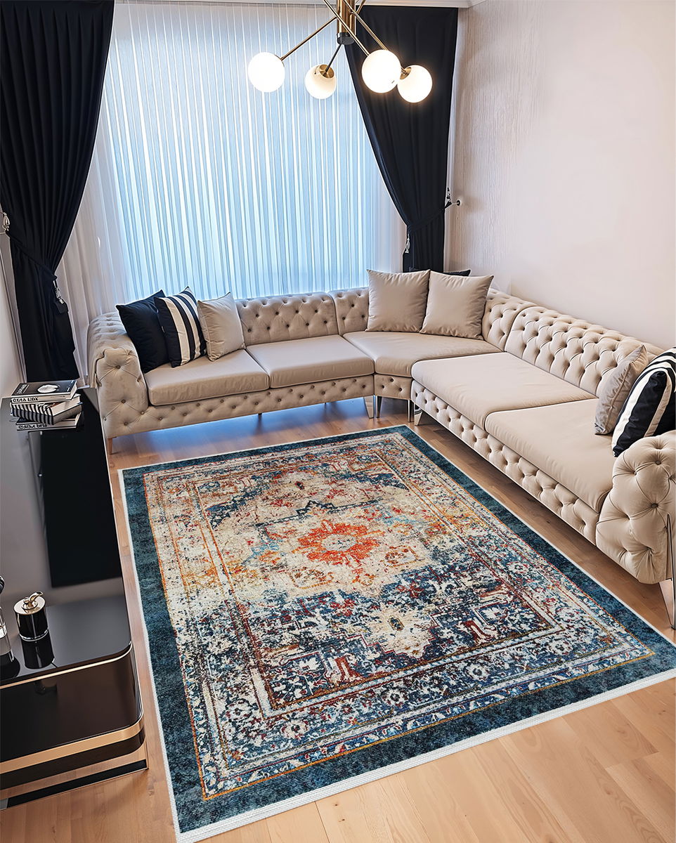 Covor pentru Dormitor 120x180 cm - Model Turcesc Albastru cu Bej - CVHD017_120x180_CVH
