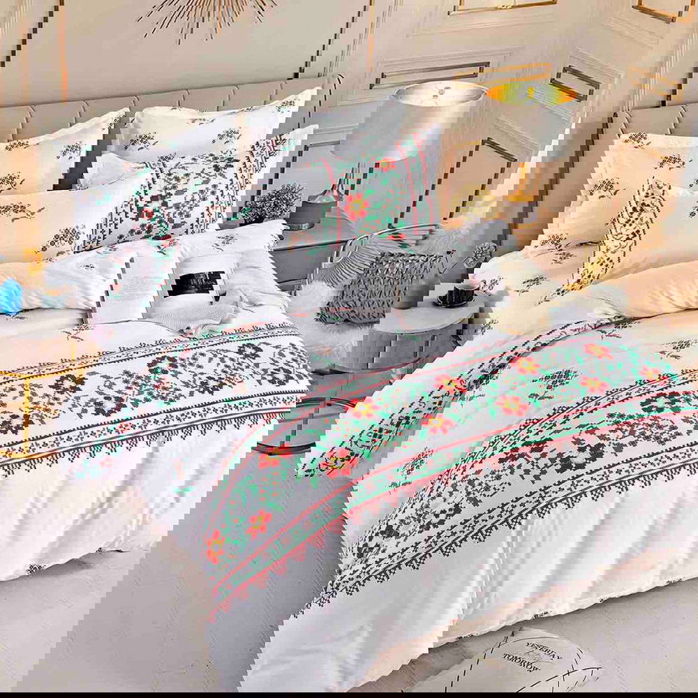 Lenjerie de pat 2 persoane (4 piese) confecționată din microfibră de calitate superioară, foarte plăcută la atingere. Datorită amestecului optim de fibre, această lenjerie asigură confort sporit prin textura sa moale și fină. Aspectul satinat al acestei lenjerii oferă eleganță și rafinament dormitorului. Cele 4 piese cu imprimeu modern sunt croite pentru a se potrivi patului tău matrimonial!
