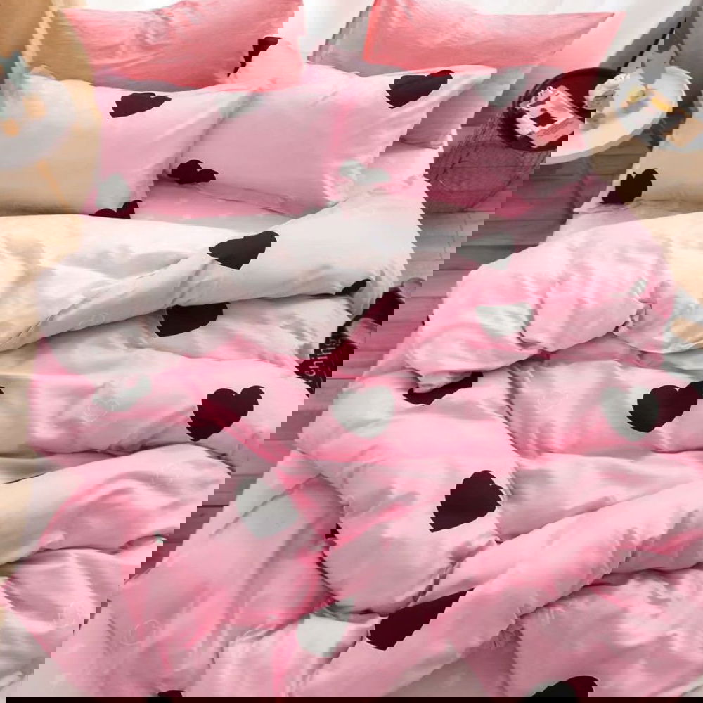 Lenjerie Bumbac Satinat 4 Piese - Roz cu Inimioare Negre - LBDP_G069B