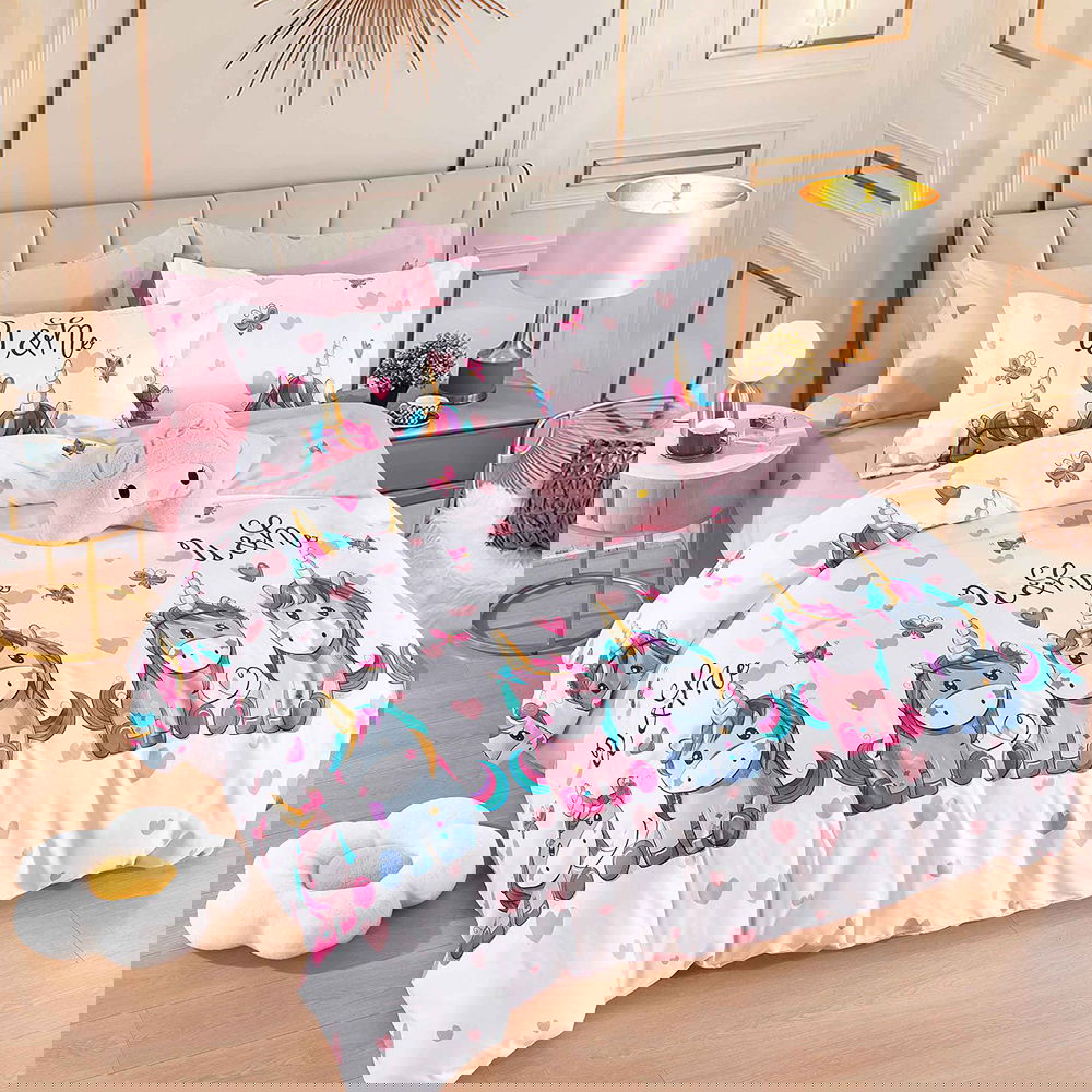 - CONȚINUTUL LENJERIEI: Acest set conține 4 piese: 1 cearceaf de pilotă (dimensiuni: 200x220 cm ±5cm), 1 cearceaf de pat cu elastic (dimensiuni: 180x200 cm ±5cm) și 2 fețe de pernă (50x70 cm ±5cm).