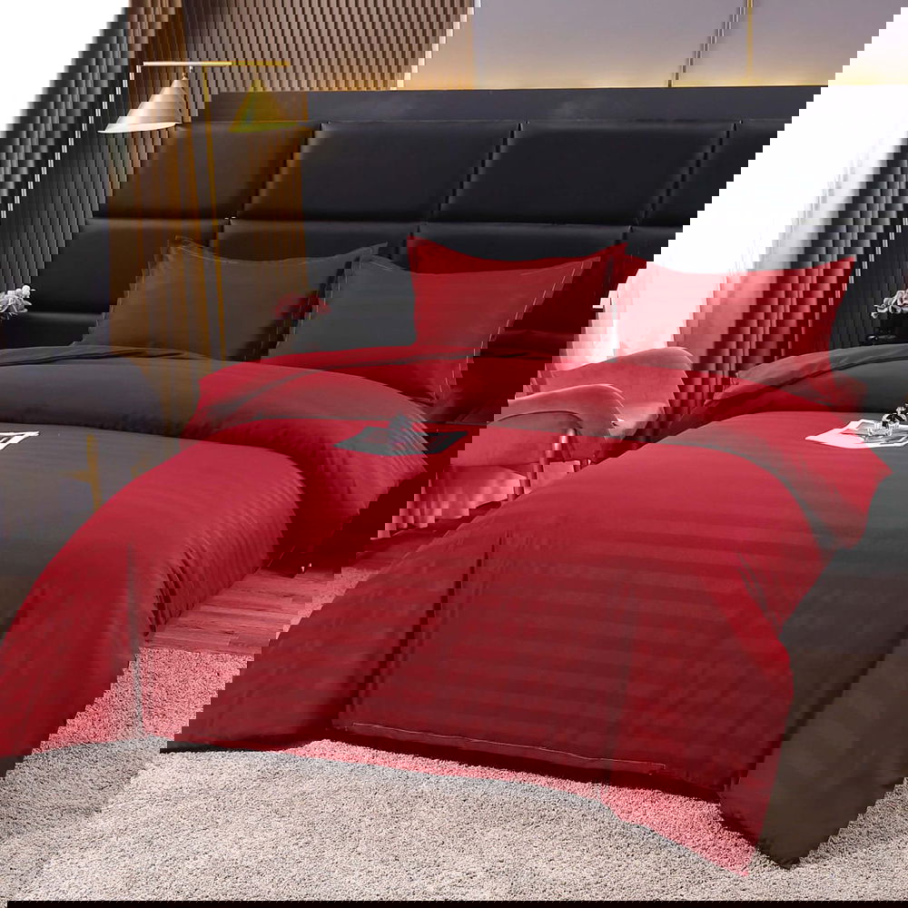 Lenjerie de Pat Damasc Premium 4 Piese cu Cearceaf Elastic - Rosu - LDEB_I058