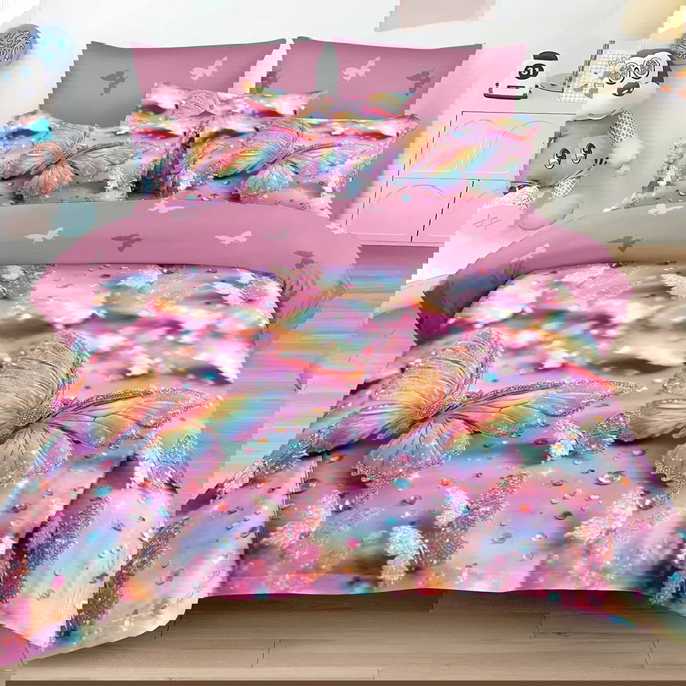 Lenjerie de Pat din Finet cu Elastic 6 Piese - 160/180x200 de Pucioasa - Roz cu Fluturi - LFEN_A040D