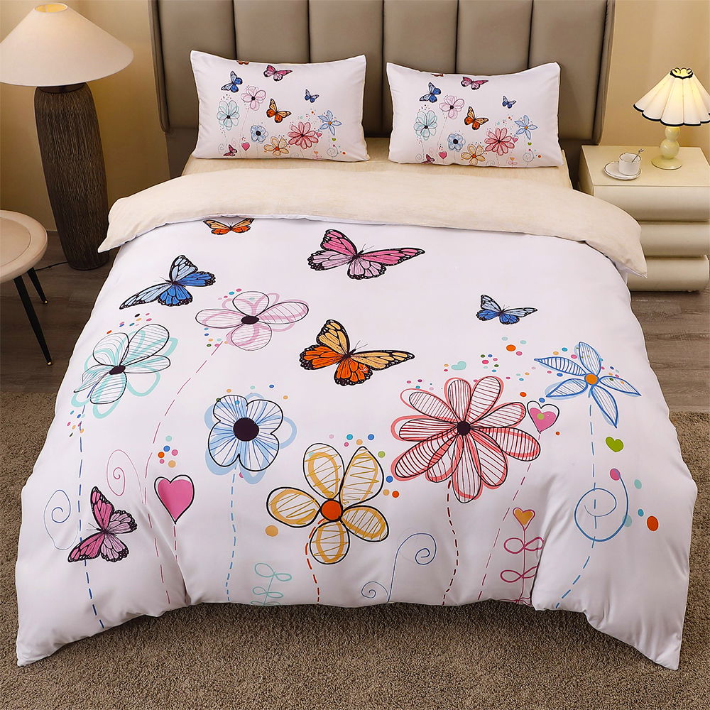 Lenjerie Fluturi si Flori Desenate din Finet 5D cu Cearceaf Elastic 160/180x200cm, 4 Piese - LFDEB_A112C