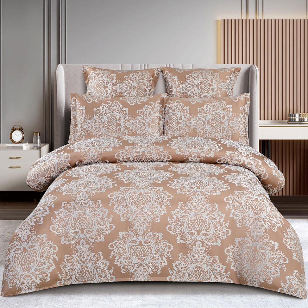 Lenjerie de pat 2 persoane (6 piese) confecționată din Jacquart Finetat cu textură mega rezistentă, foarte moale la atingere. Datorită conținutului de bumbac din compoziție, această lenjerie asigură confort sporit și este potrivită în orice perioadă a anului lăsând pielea să respire, material fiind gros și extrem de rezistent. Țesătura este de cea mai bună calitate, iar dacă lenjeria este întreținută corespunzător, culorile se vor menține la fel de intense, nu intră la spălat, nu se șifonează și nu se scămoșează indiferent de numărul de spălări. Lenjeria este tip Jacquard, aspectul său fiind unul extrem de elegant.