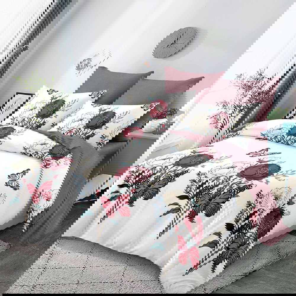 Lenjerie de Pat din Finet cu Elastic 6 Piese - 160/180x200 cm - Fluturi Grena cu Flori - LFEM_A002D