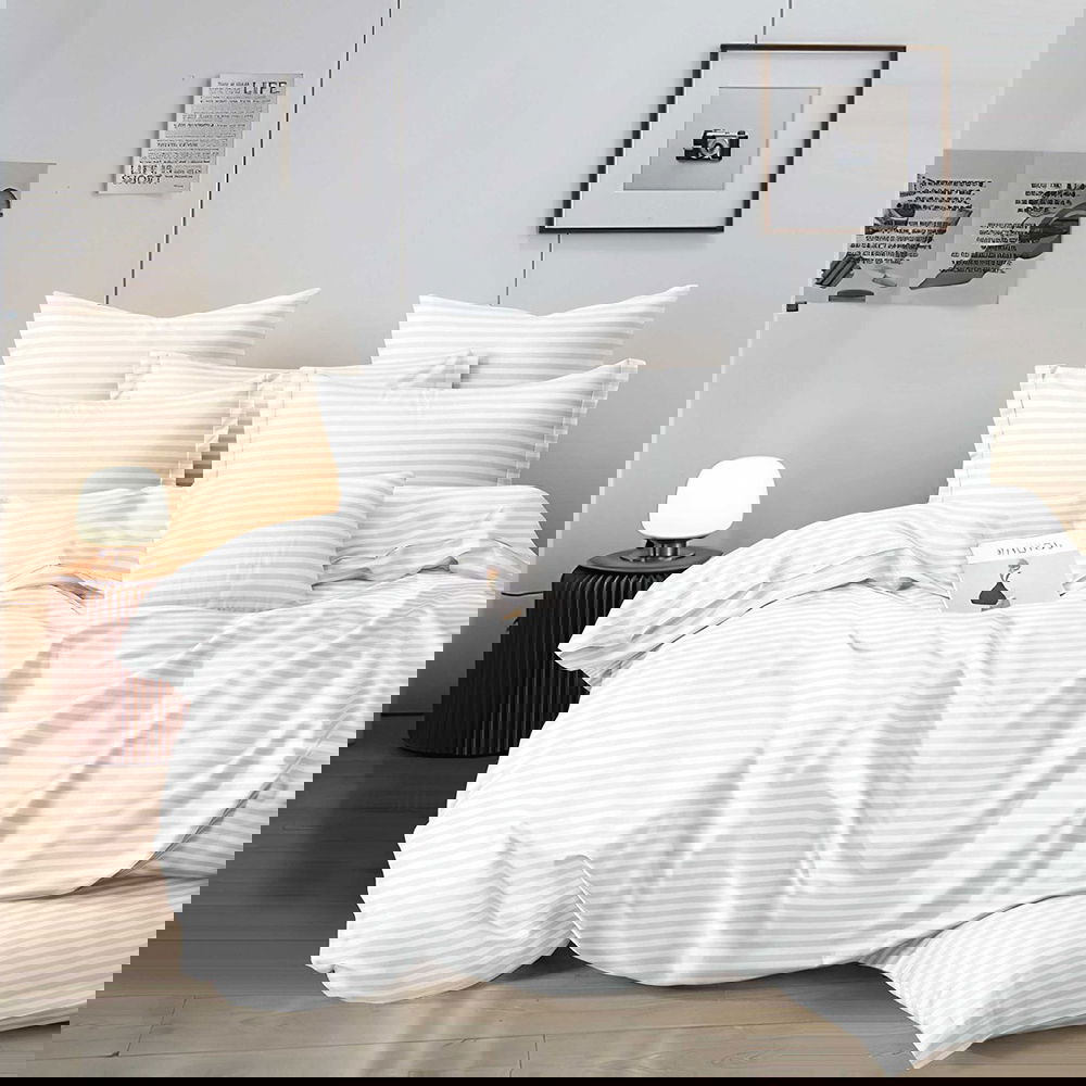 Lenjerie de Pat Damasc Premium 6 Piese cu Cearceaf Elastic - Alb - LDES_H034