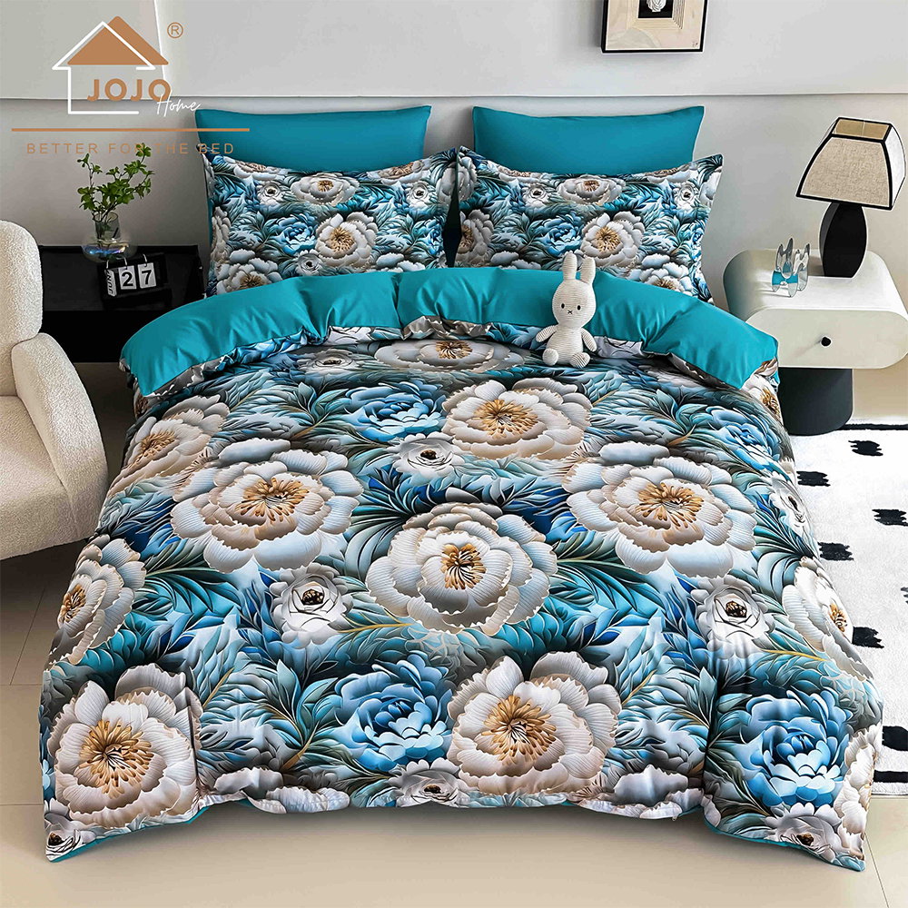 Lenjerie 6 Piese Bumbac Finet 5D cu Elastic - Flori Albe si Bleu Sculptate - LFDEJ_C148B