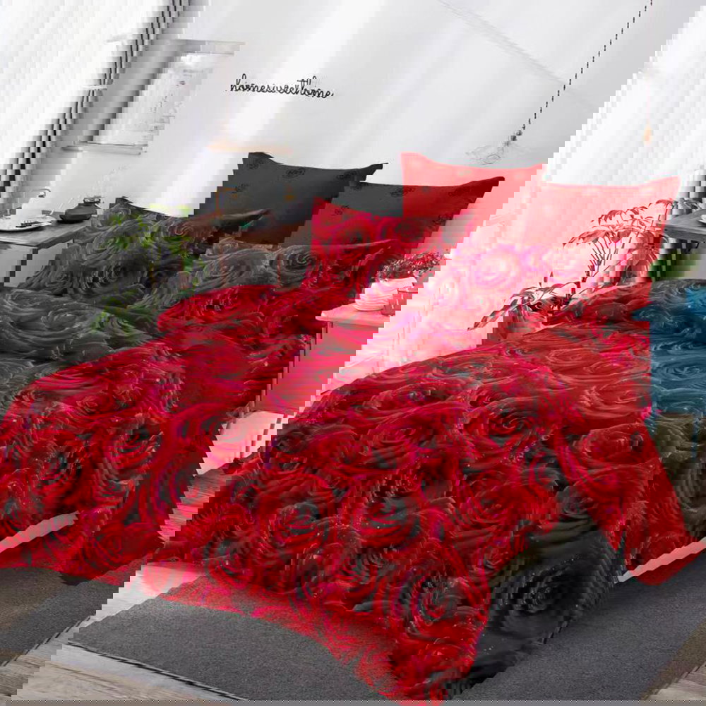 Lenjerie de Pat din Finet cu Elastic 6 Piese - 160/180x200 de Pucioasa - Trandafiri Rosii - LFEN_A042D