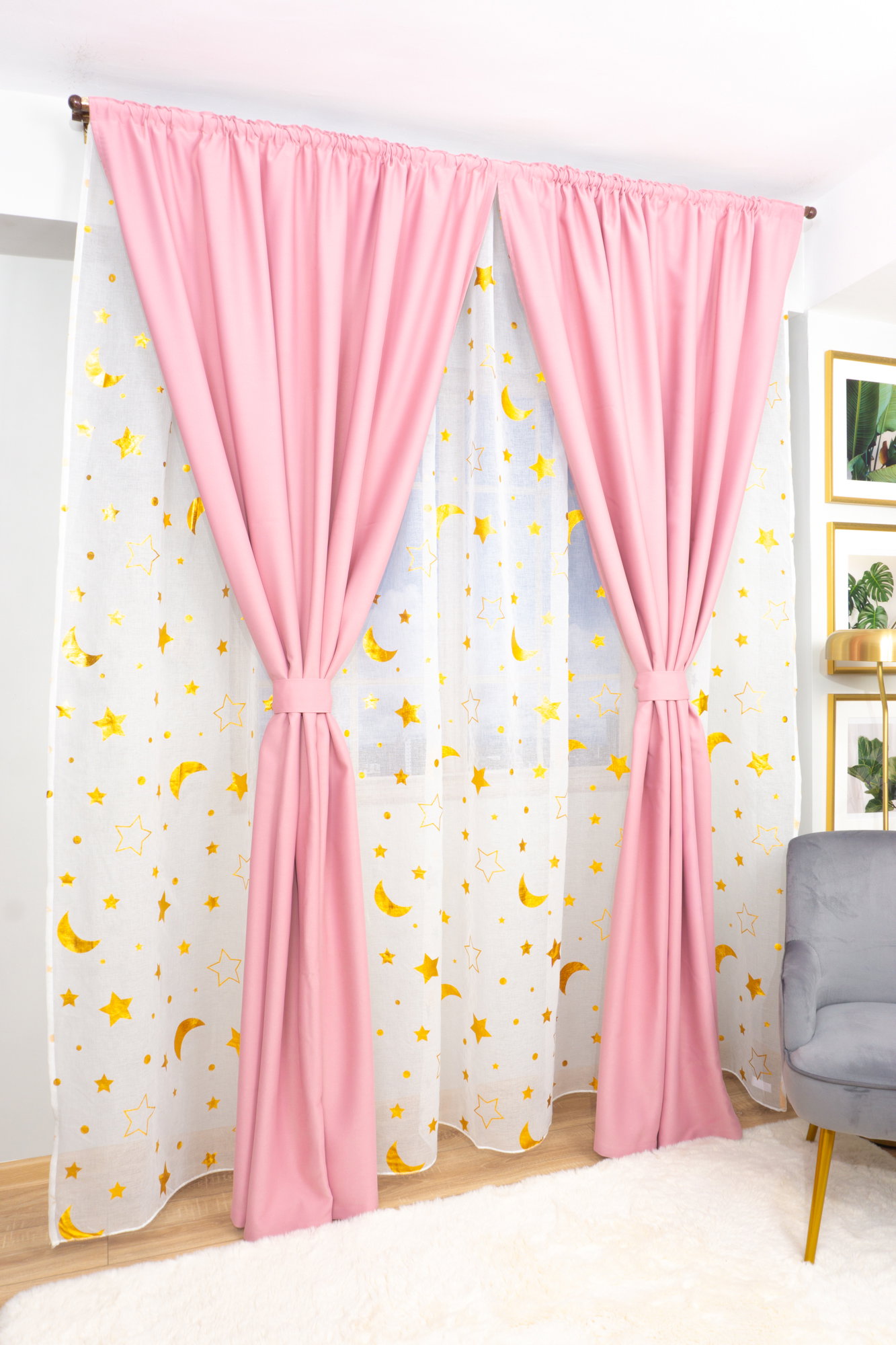 Set Amelia - Perdea din In Star Gold - PERD044B_300x245_E1_05_ATL si 2 Draperii Blackout Roz Drajeu - BOTD049_100X245_C3_15_ATL cu Rejansa Set_ATL
