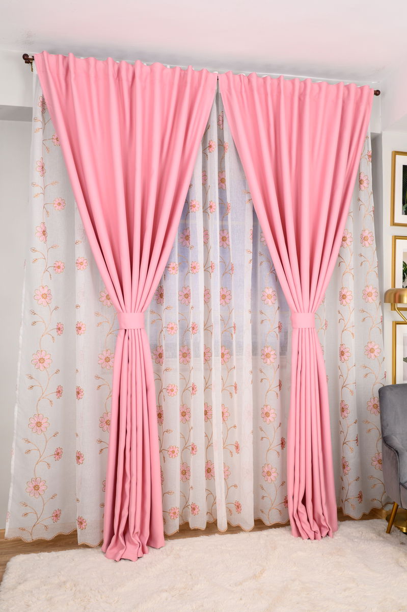 Set Astrallia - Perdea Flori de Dor Roz cu Crem si Draperie Blackout Roz Drajeu