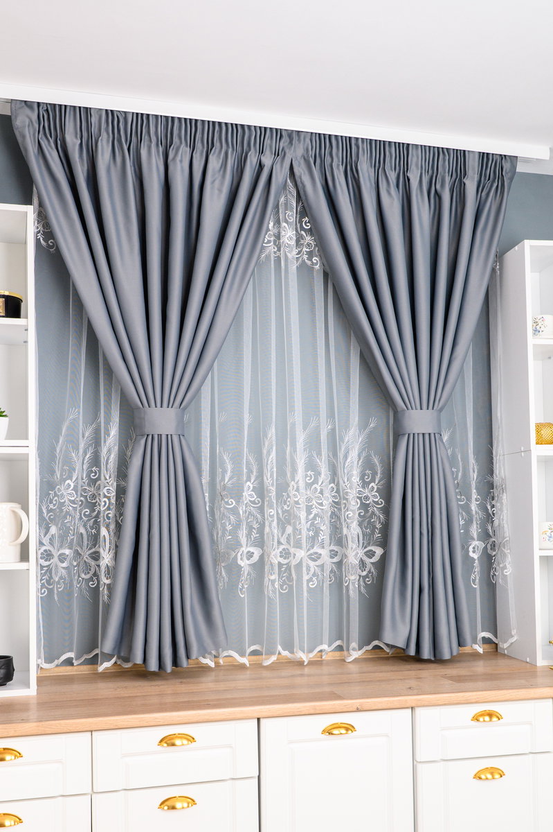 Set Bucatarie Amadora - Perdea de Bucatarie Sofia cu Fluturi Gri - si Draperie Blackout Gri Metalic