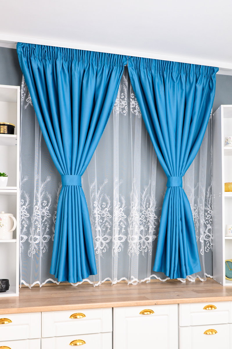 Set Bucatarie Asker - Perdea de Bucatarie Sofia cu Fluturi Albi - si Draperie Blackout Turcoaz Elegant