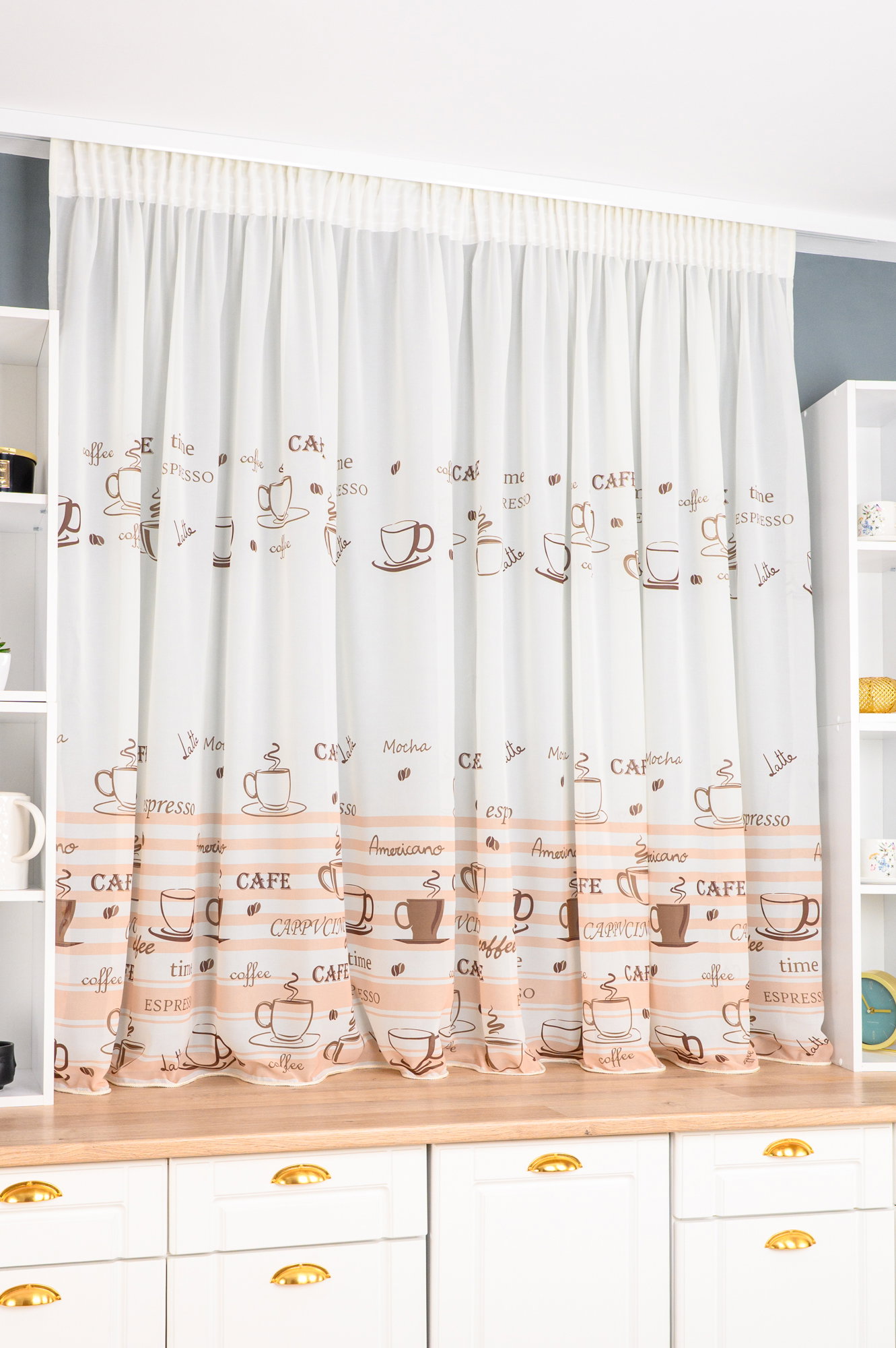 Set Bucatarie Elise - Perdea Bucatarie Cescute Aurii și Albe din In si Draperie Blackout - Cappuccino
