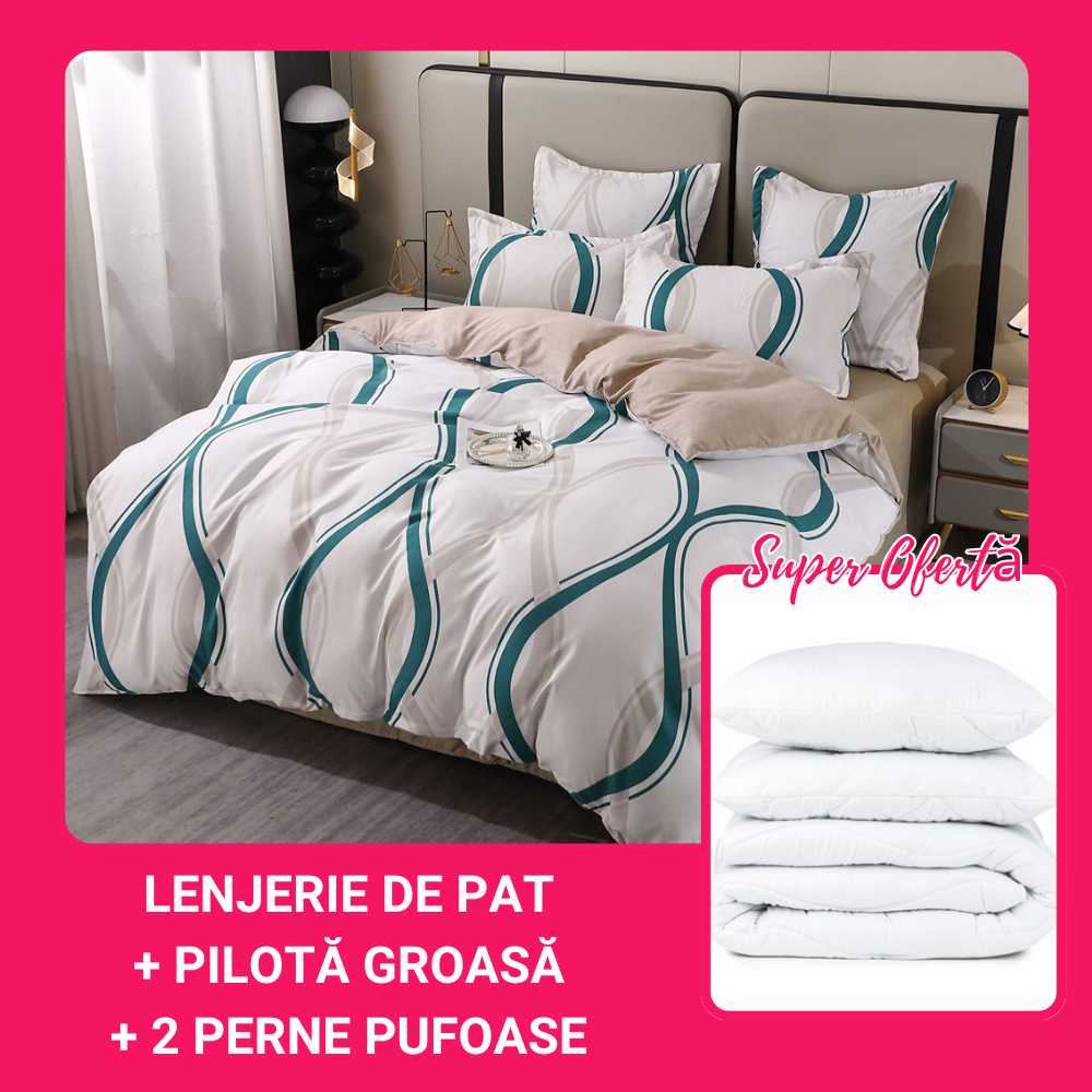 Pachetul conține: lenjerie de pat 2 persoane (6 piese) confecționată din bumbac finet de calitate superioară, foarte plăcut la atingere, plus 1 pilotă groasă de iarnă 200x220 cm. Datorită amestecului optim de bumbac și finet, lenjeria asigură confort sporit prin textura sa moale și fină. Aspectul acestei lenjerii oferă eleganță și rafinament dormitorului. Cele 6 piese cu imprimeu modern sunt croite pentru a se potrivi patului tău matrimonial! Pilota este umplută cu vatelină călduroasă și are densitate de 350g/mp.