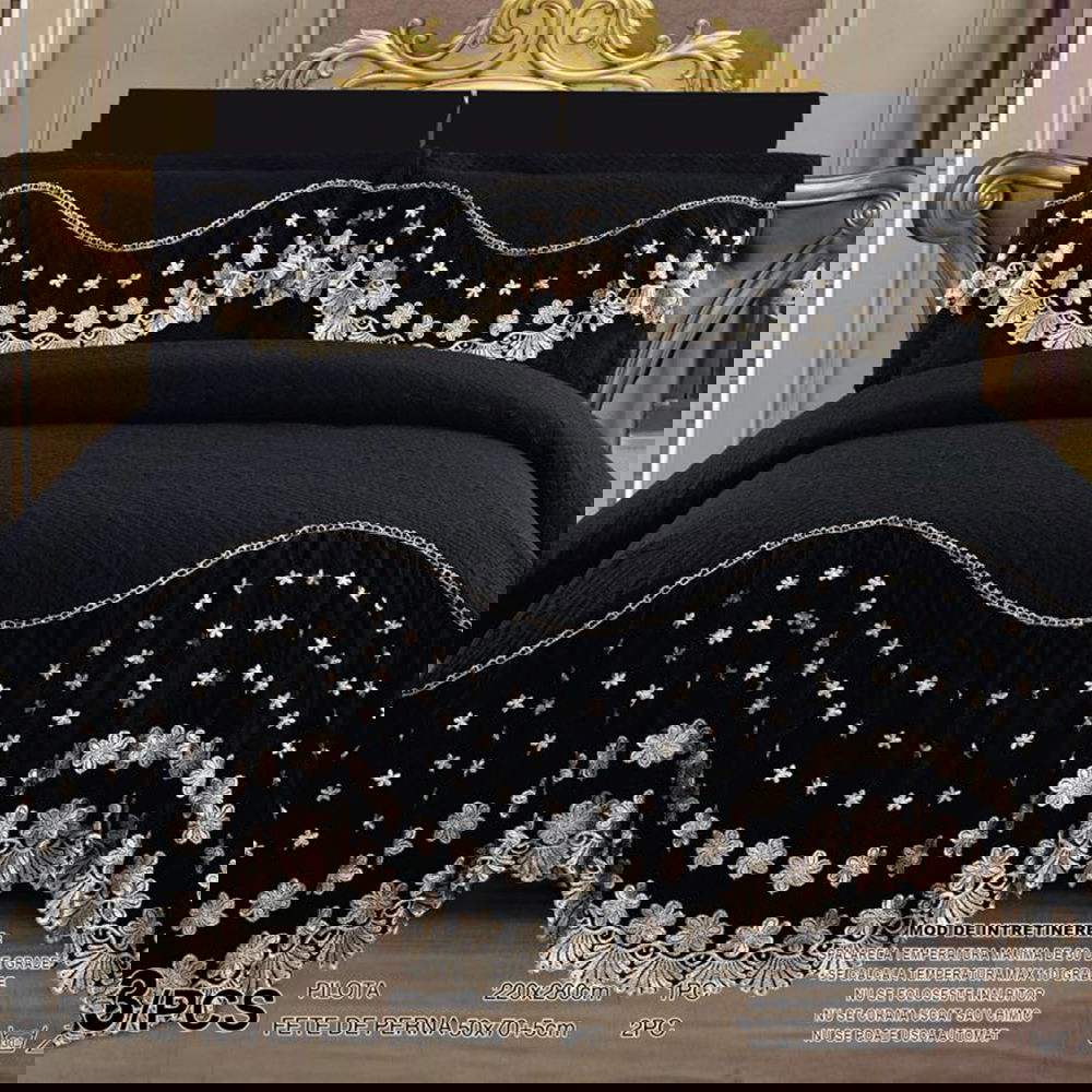 Set Cuvertura de Pat Uni cu Dantela + 2 Fete de Perna - Detalii Aurii - CVD0007
