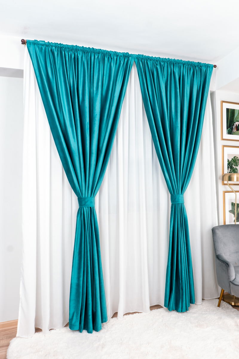 Set Lefkada - Draperie din Catifea Turcoaz si Perdea Matase Alba Nobila