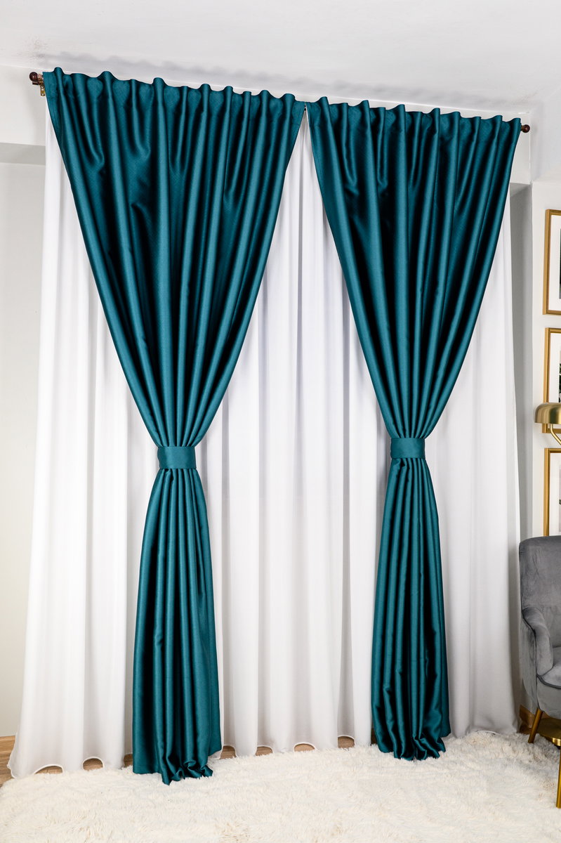 Set Selma - Perdea Matase Alba Nobila si Draperie Blackout 100% Perfect Turcoaz Metalizat