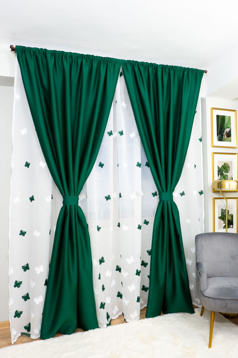 Set Sydney - Perdea din In cu Fluturi Verde Intens PERD0150_300X245_D2_17_ATL si Draperii Blackout Verde Smarald - BOTD004_100X245_C1_15_ATL cu Rejansa Set_ATL