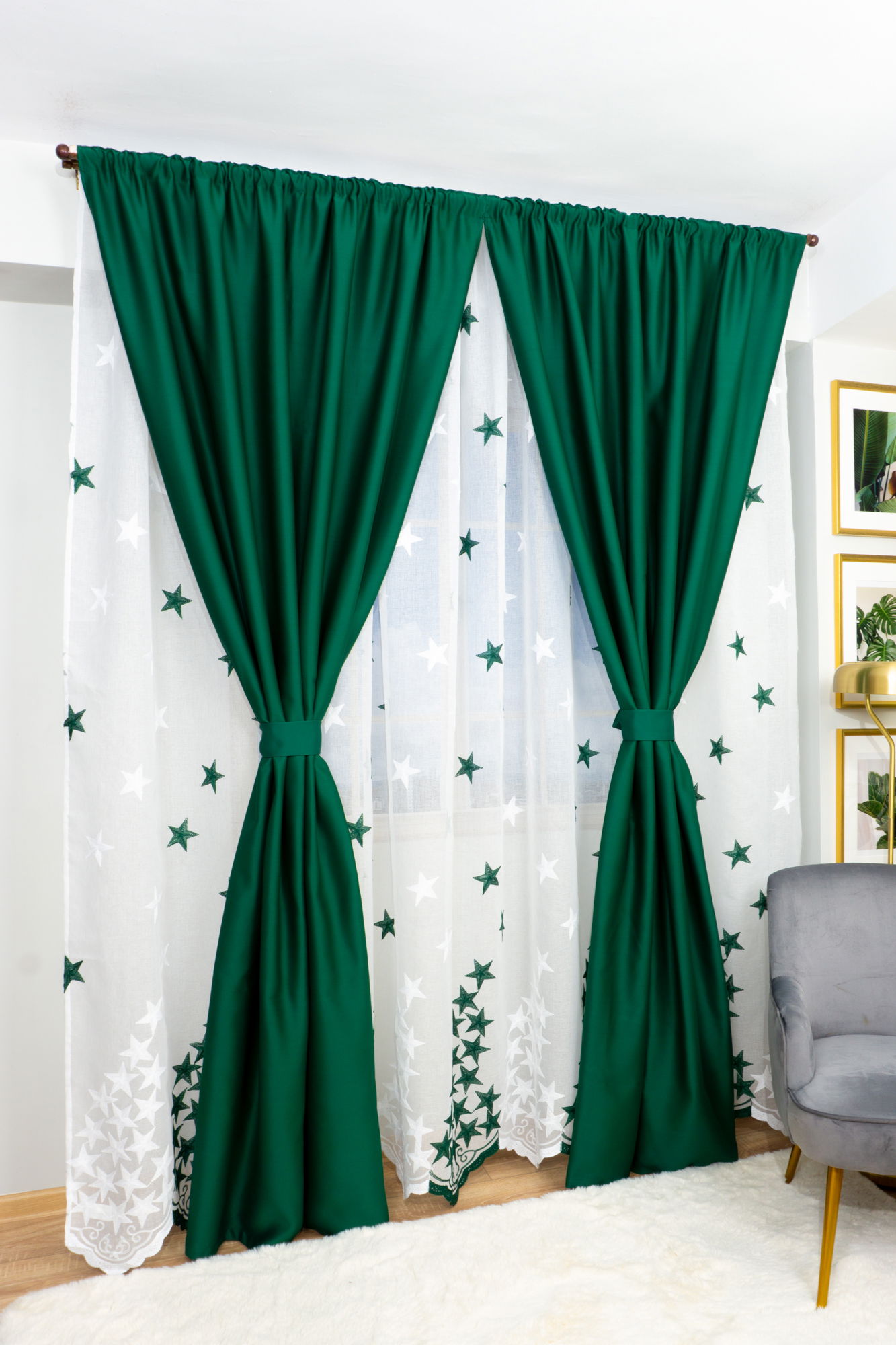 Set Ophelia - Perdea din In cu Stelute Verde Intens si Draperie Blackout Verde Smarald