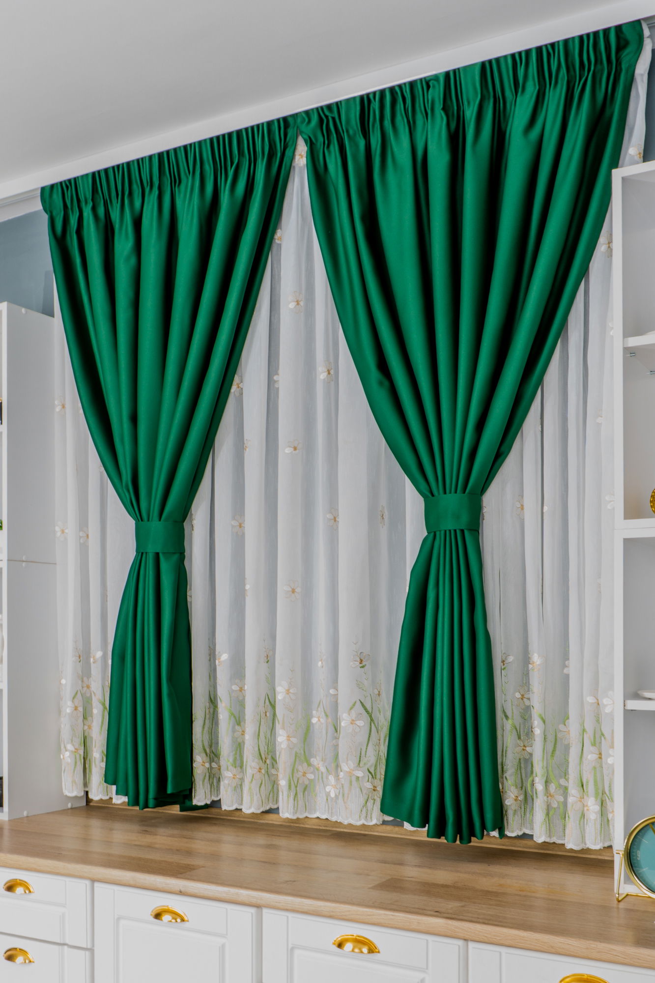 Set Bucatarie Mika - Perdea de Bucatarie - Flori Musetel si Draperie Blackout Verde Smarald