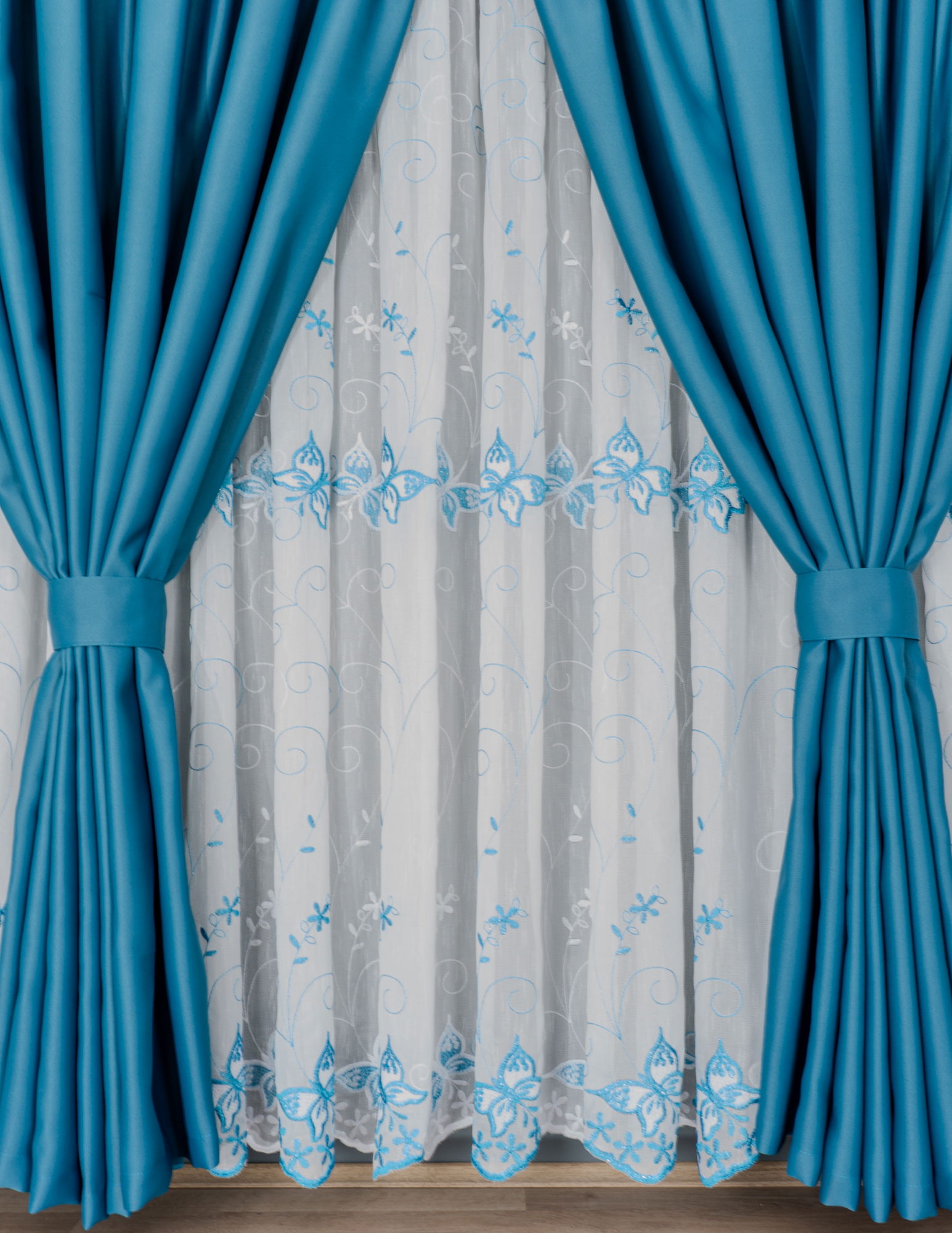 Set Bucatarie Catrina - Perdea de Bucatarie - Zborul Fluturilor Turcoaz cu Alb si Draperie Blackout Turcoaz Elegant