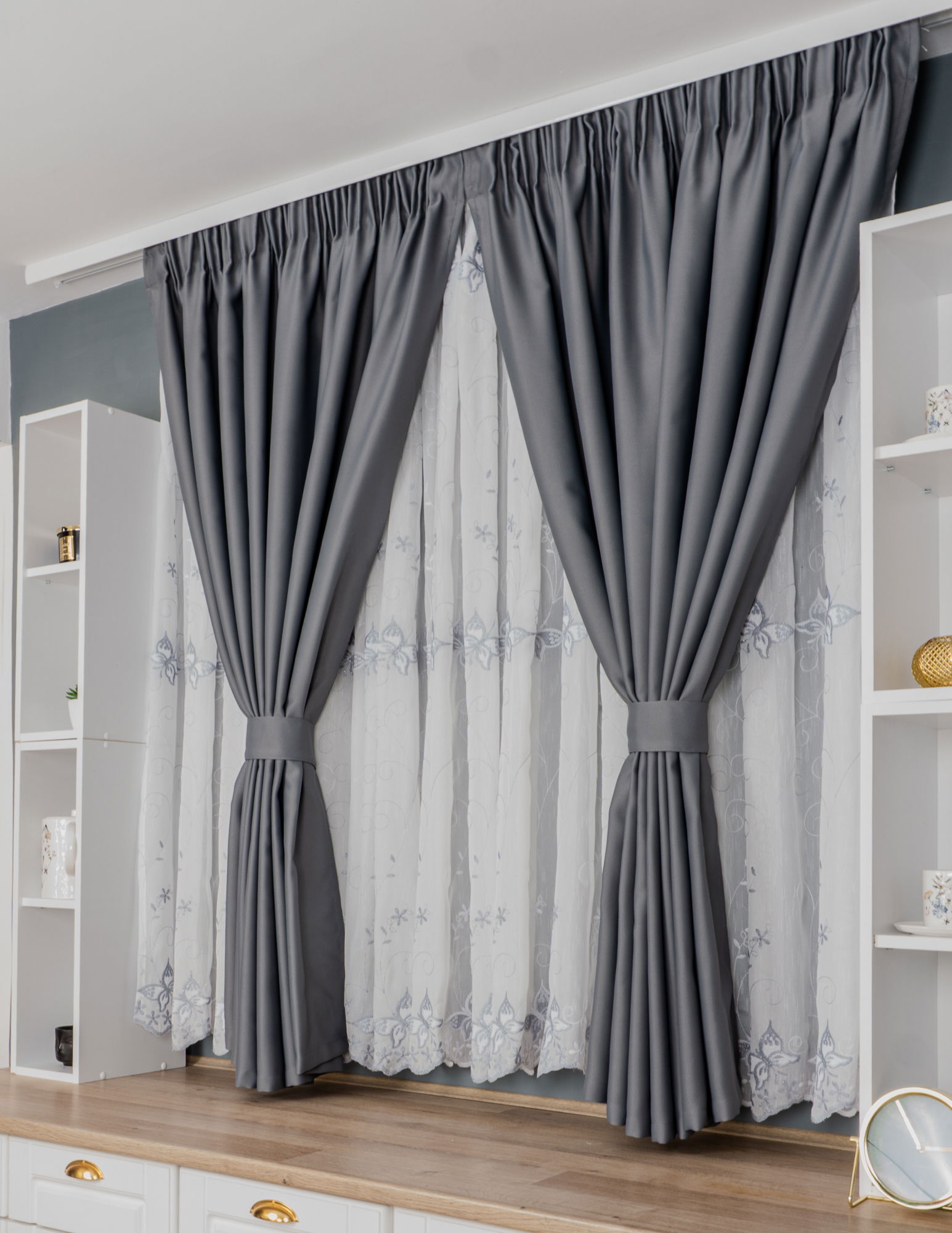 Set Bucatarie Paola - Perdea de Bucatarie - Zborul Fluturilor Argintii si Draperie Blackout Gri Metalic